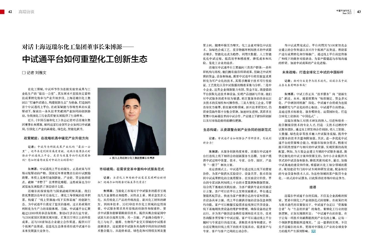 近日,《中國(guó)石油和化工》雜志記者對(duì)話邁瑞爾集團(tuán)董事長(zhǎng)朱博源,解碼這家行業(yè)領(lǐng)軍企業(yè)如何以中試破局,引領(lǐng)化工產(chǎn)業(yè)向高端化、綠色化、智能化躍升。