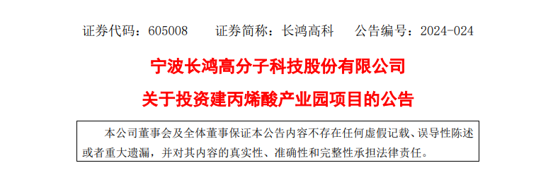 長鴻高科4月29日晚間公告,公司擬在廣東省茂名市濱海新區(qū)投資建設(shè)新項目“丙烯酸產(chǎn)業(yè)園項目”,項目總投資約115億元。長鴻高科稱,該項目將顛覆性地以丙烷為原料直接氧化生產(chǎn)中間產(chǎn)品丙烯酸,再采用酯化、聚合工藝生產(chǎn)高附加值的丙烯酸酯及SAP產(chǎn)品,符合新質(zhì)生產(chǎn)力的發(fā)展要求。
