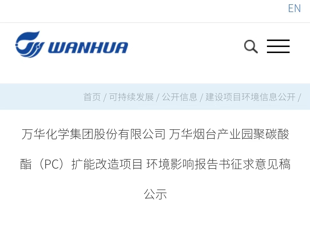 近日,萬華化學(xué)官網(wǎng)發(fā)布了萬華化學(xué)集團(tuán)股份有限公司萬華煙臺產(chǎn)業(yè)園聚碳酸酯(PC)擴(kuò)能改造項(xiàng)目環(huán)境影響報(bào)告書征求意見稿公示。