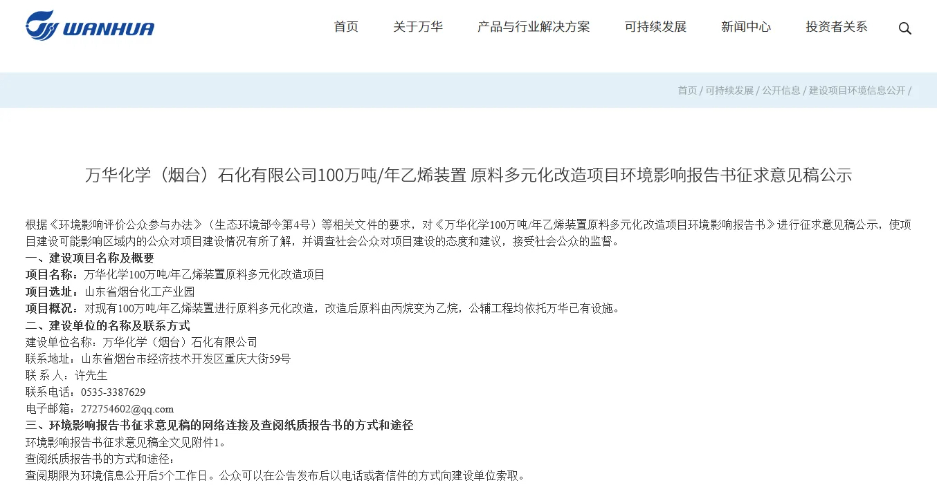 6月11日,萬華化學(煙臺)石化有限公司100萬噸/年乙烯裝置原料多元化改造項目環(huán)評報告書征求意見稿公示。