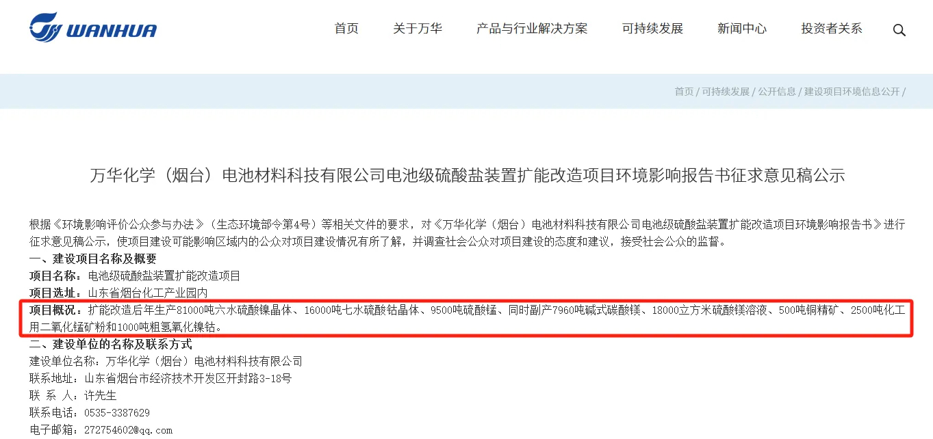 6月7日,萬華化學(煙臺)電池材料科技有限公司電池級硫酸鹽裝置擴能改造項目環(huán)評報告書征求意見稿公示。