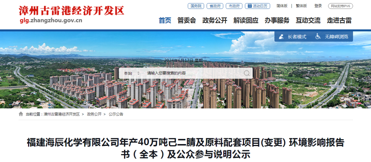 6月14日,漳州古雷開(kāi)發(fā)區(qū)管委會(huì)發(fā)布公告,對(duì)福建海辰化學(xué)有限公司年產(chǎn)40萬(wàn)噸己二腈及原料配套項(xiàng)目(變更) 環(huán)境影響報(bào)告書(shū)(全本)及公眾參與說(shuō)明進(jìn)行公示。