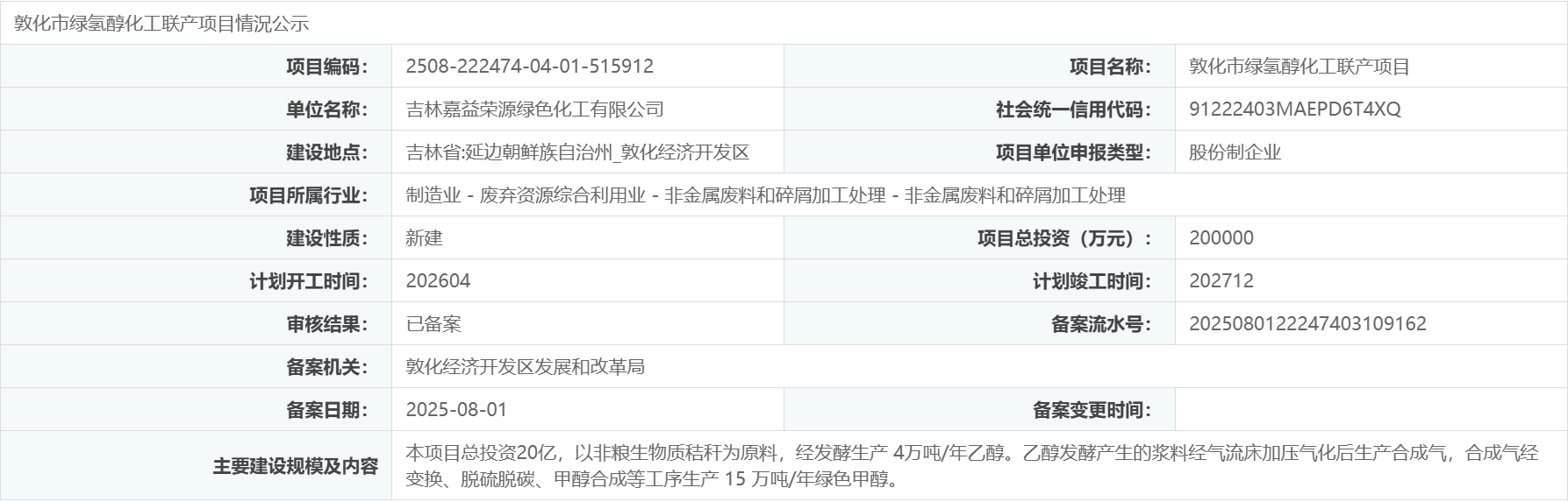 嘉澤新能源敦化綠氫醇項(xiàng)目備案