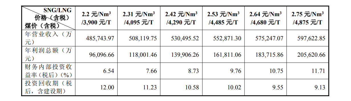項(xiàng)目經(jīng)濟(jì)效益評(píng)價(jià):按照項(xiàng)目建設(shè)期3年,第4年投產(chǎn)且生產(chǎn)負(fù)荷達(dá)到80%,第5年達(dá)產(chǎn);項(xiàng)目經(jīng)濟(jì)服務(wù)年限為15年,所得稅率25%,年生產(chǎn)121428萬(wàn)Nm³合成天然氣(SNG)、58.2672萬(wàn)噸液化天然氣(LNG),按照煤價(jià)150元/噸—160元/噸(含稅,燃料煤150元/噸、原料煤160元/噸)測(cè)算,在不同的SNG/LNG銷(xiāo)售價(jià)格時(shí),募投項(xiàng)目的財(cái)務(wù)內(nèi)部投資收益率(稅后)為6.54%—11.71%,投資回收期(稅后,含建設(shè)期)為9.13年—12年。