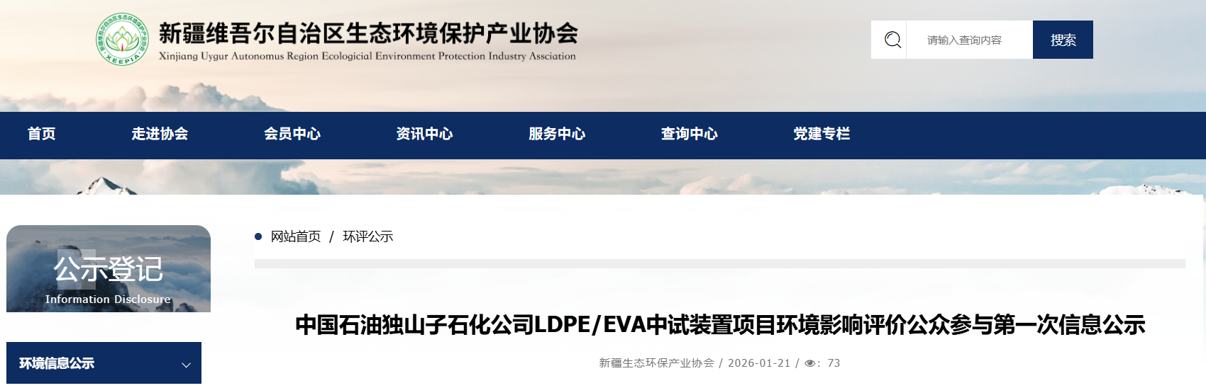 1月21日,新疆維吾爾自治區(qū)生態(tài)環(huán)境保護(hù)產(chǎn)業(yè)協(xié)會發(fā)布公告,中國石油獨山子石化公司LDPE/EVA中試裝置項目環(huán)境影響評價公眾參與第一次信息公示。