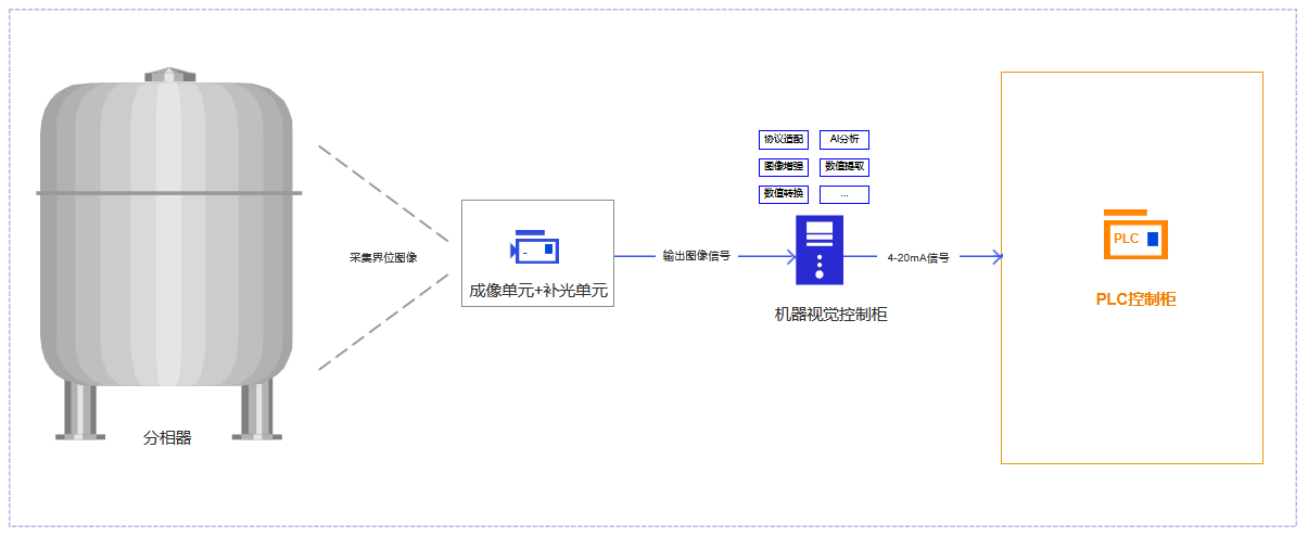 針對(duì)分相器內(nèi)貧富相分相界位的識(shí)別問(wèn)題,傳統(tǒng)的檢測(cè)方法包括接觸式傳感器(如浮球傳感器)、界位計(jì)、非接觸式激光或超聲波檢測(cè)等均不能滿足對(duì)于分相液位的識(shí)別需求,美斯頓致力于開(kāi)發(fā)針對(duì)環(huán)保處理行業(yè)的 IoT(物聯(lián)網(wǎng))技術(shù),提供一種基于AI視覺(jué)的非接觸式界位分相檢測(cè)系統(tǒng)即機(jī)器眼InteligentEye,該機(jī)器眼產(chǎn)品通過(guò)深度學(xué)習(xí)模型實(shí)現(xiàn)多場(chǎng)景下的自適應(yīng)界位識(shí)別,并引入硬件聯(lián)動(dòng)系統(tǒng),實(shí)現(xiàn)報(bào)警和控制動(dòng)作,實(shí)現(xiàn)對(duì)不同胺液體系分相界面的高精度、實(shí)時(shí)檢測(cè)及預(yù)警處理。促進(jìn)傳統(tǒng)工業(yè)的運(yùn)營(yíng)和維護(hù)流程向數(shù)字化轉(zhuǎn)型。