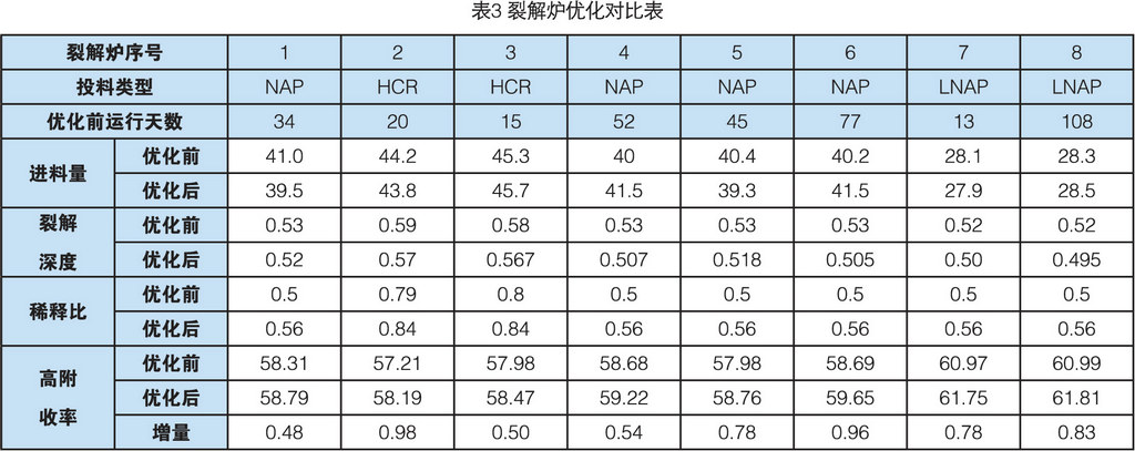 該項(xiàng)目中,RTO建模范圍包括進(jìn)料分配系統(tǒng)、裂解爐、急冷系統(tǒng)、壓縮系統(tǒng)和分離系統(tǒng),共涉及反應(yīng)爐11臺,塔、罐、壓縮機(jī)、泵和閥門等設(shè)備285臺,換熱模塊541個,測量儀表1127塊;建立優(yōu)化變量112個,約束變量124個;RTO模型規(guī)模達(dá)到12萬個變量、12萬個方程式。系統(tǒng)上線后RTO模型每間隔3小時進(jìn)行一次優(yōu)化計算,優(yōu)化結(jié)果作傳遞給APC作為CV的設(shè)定值,APC以此設(shè)定值為目標(biāo),在15分鐘內(nèi)完成操作調(diào)節(jié),達(dá)到設(shè)定目標(biāo)。