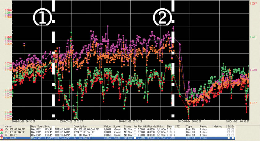 設(shè)備性能和工藝性能的在線監(jiān)測主要利用了RTO模型可在線整定或在線模擬計算的功能。設(shè)備性能在線監(jiān)測常見的包括:冷換設(shè)備的換熱系數(shù)、塔板效率、機(jī)泵和壓縮機(jī)效率等。工藝性能在線監(jiān)測常見的包括:催化劑壽命、液泛、工藝節(jié)能等。??松梨陂_展的數(shù)字孿生應(yīng)用中,用RTO模型在線計算各換熱器的總括換熱系數(shù),繼而計算成污垢系數(shù)用于指導(dǎo)換熱器清洗除垢工作。隨著換熱器運(yùn)行,換熱器管程或殼程結(jié)垢加劇使得污垢系數(shù)增加,導(dǎo)致?lián)Q熱器換熱效果變差。當(dāng)污垢系數(shù)增加到一定程度后產(chǎn)生報警,提醒用戶及時清洗換熱器進(jìn)行除垢。圖1顯示的是埃克森美孚某常減壓裝置的4臺原油與分餾塔側(cè)線換熱器用RTO模型在線計算污垢系數(shù)形成的曲線,圖中可以看出紫色、橙色、綠色、紅色對應(yīng)的4臺換熱器垢系數(shù)開始都挺大,且隨著時間推移持續(xù)上升。在時點(diǎn)1對紅色、綠色曲線對應(yīng)的換熱器進(jìn)行了清洗,二者污垢系數(shù)顯著下降,紫、橙色換熱器污垢系數(shù)仍維持較高水平并持續(xù)上升。在時點(diǎn)2對四個換熱器同時進(jìn)行清洗,所有換熱器污垢系數(shù)顯著下降。